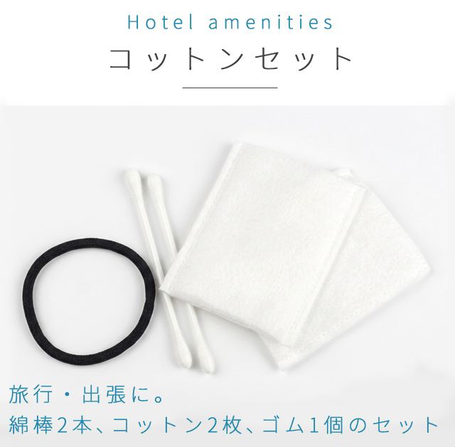 旅行、来客用、ホテル備品、入院などさまざまな場所でお役立ちのホテルアメニティシリーズ。衛生的で持ち運びに便利な個包装◆スキンケアの定番品、コットン、綿棒、ヘアゴムのセット。