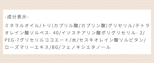 ミネラルオイル/トリ(カプリル酸/カプリン酸)グリセリル/テトラオレイン酸ソルベス- 40/イソステアリン酸ポリグリセリル- 2/PEG-7グリセリルココエート/水/セスキオレイン酸ソルビタン/ローズマリーエキス/BG/フェノキシエタノール