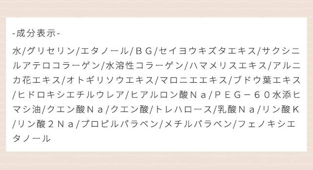 水/グリセリン/エタノール/BG/セイヨウキズタエキス/サクシニルアテロコラーゲン/水溶性コラーゲン/ハマメリスエキス/アルニカ花エキス/オトギリソウエキス/マロニエエキス/ブドウ葉エキス/ヒドロキシエチルウレア/ヒアルロン酸Na/PEG−60水添ヒマシ油/クエン酸Na/クエン酸/トレハロース/乳酸Na/リン酸K/リン酸2Na/プロピルパラベン/メチルパラベン/フェノキシエタノール