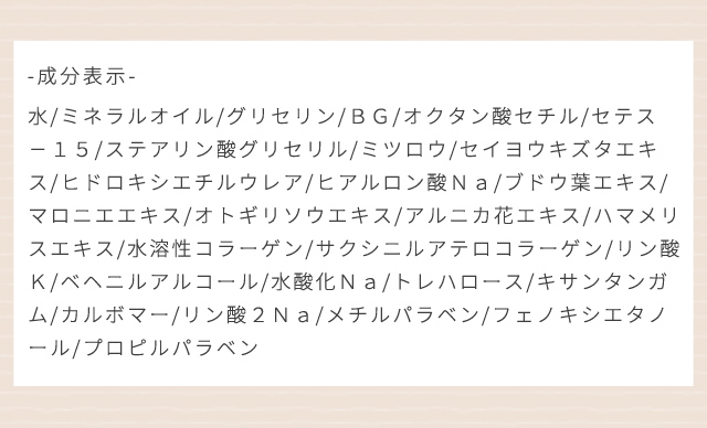 水/ミネラルオイル/グリセリン/BG/オクタン酸セチル/セテス−15/ステアリン酸グリセリル/ミツロウ/セイヨウキズタエキス/ヒドロキシエチルウレア/ヒアルロン酸Na/ブドウ葉エキス/マロニエエキス/オトギリソウエキス/アルニカ花エキス/ハマメリスエキス/水溶性コラーゲン/サクシニルアテロコラーゲン/リン酸K/ベヘニルアルコール/水酸化Na/トレハロース/キサンタンガム/カルボマー/リン酸2Na/メチルパラベン/フェノキシエタノール/プロピルパラベン