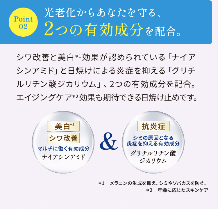 美白有効成分「ナイアシンアミド」と抗炎症成分「グリチルリチン酸ジカリウム」を配合した、医薬部外品です。